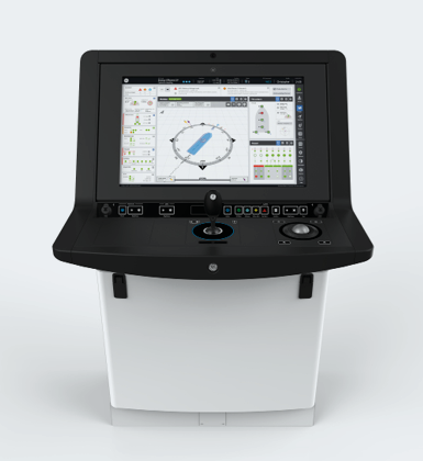 The novel introduction of a pivoting screen allows the operator to stand close to the console for comfortable accurate touch control, whilst also gripping the deep edge profiles for support in rough weather. Feedback images from the screen can be transferred to any monitor on an overhead display and viewed from distance.